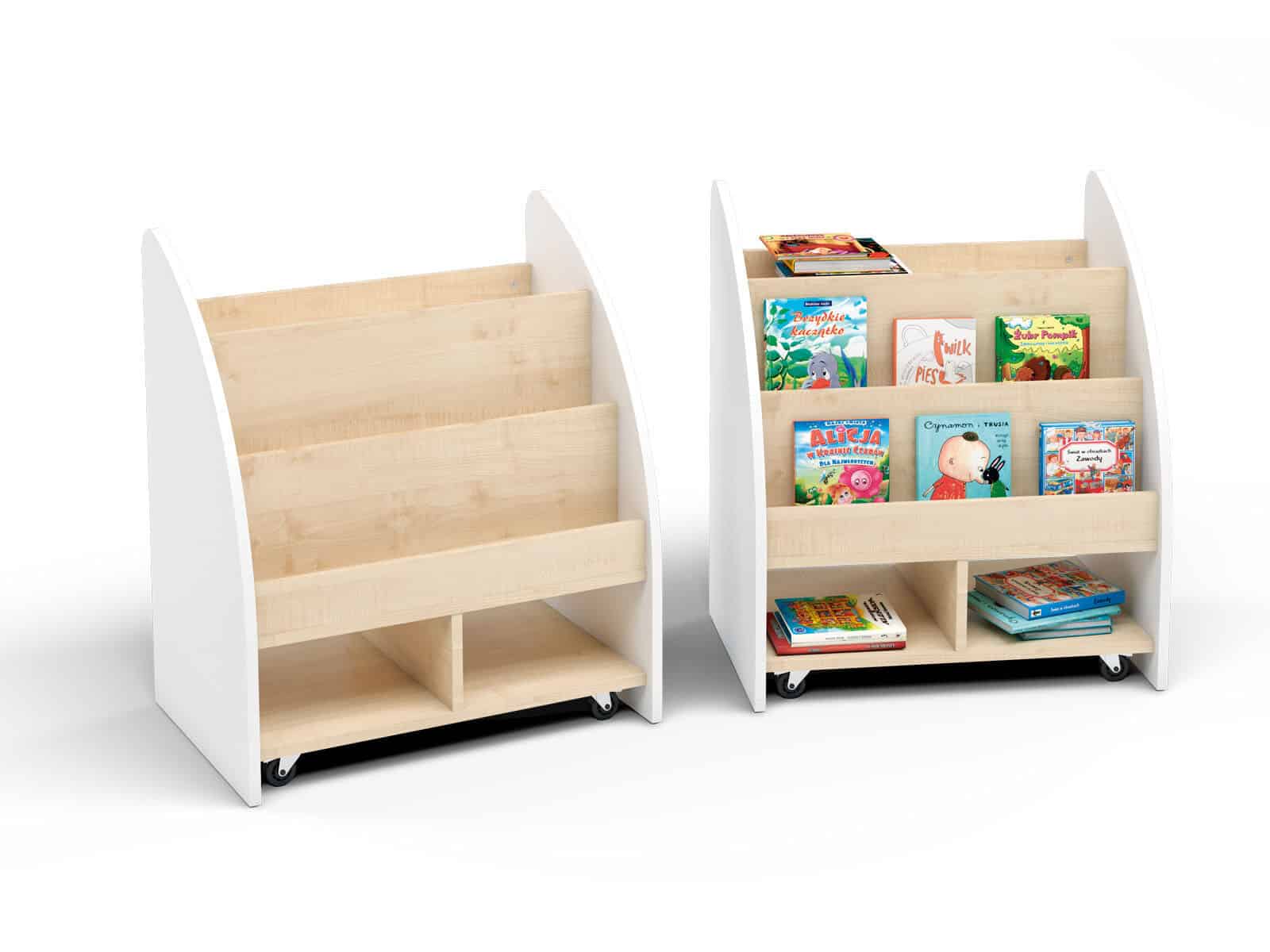 Reolen giver praktisk opbevaringsplads til bøger, legetøj og materialer og tåler daglig brug i institutioner.