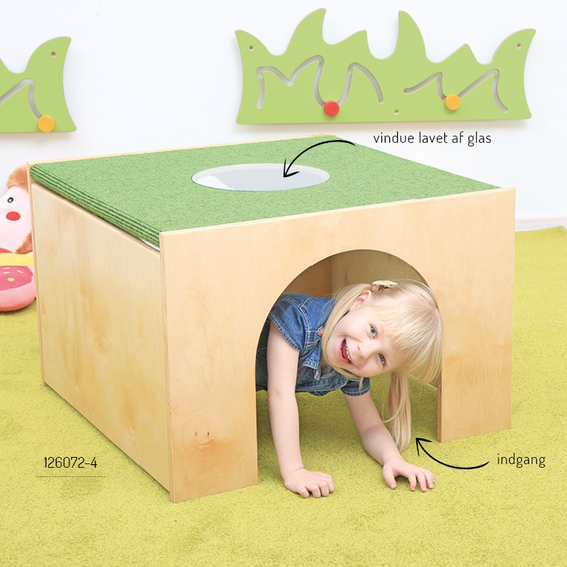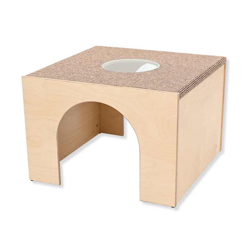I midten af podiet findes et glasvindue (dia. 25 cm), som giver børn mulighed for at kigge igennem og udforske omgivelserne. Hul i to af væggene gør det nemt at komme ind og ud, hvilket gør podiet til en sjov og interaktiv lege- og motorikzone.
