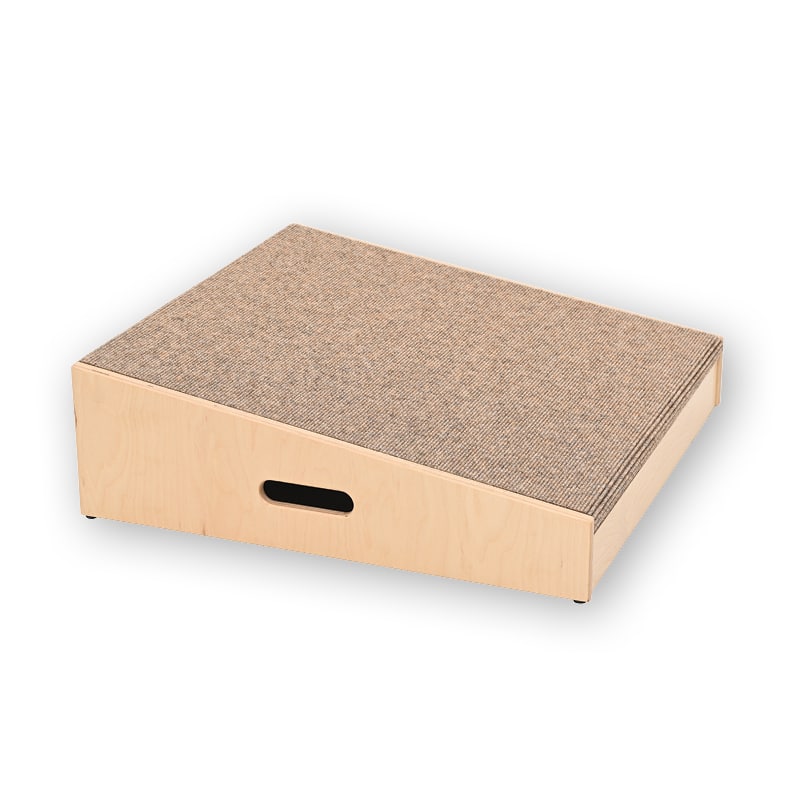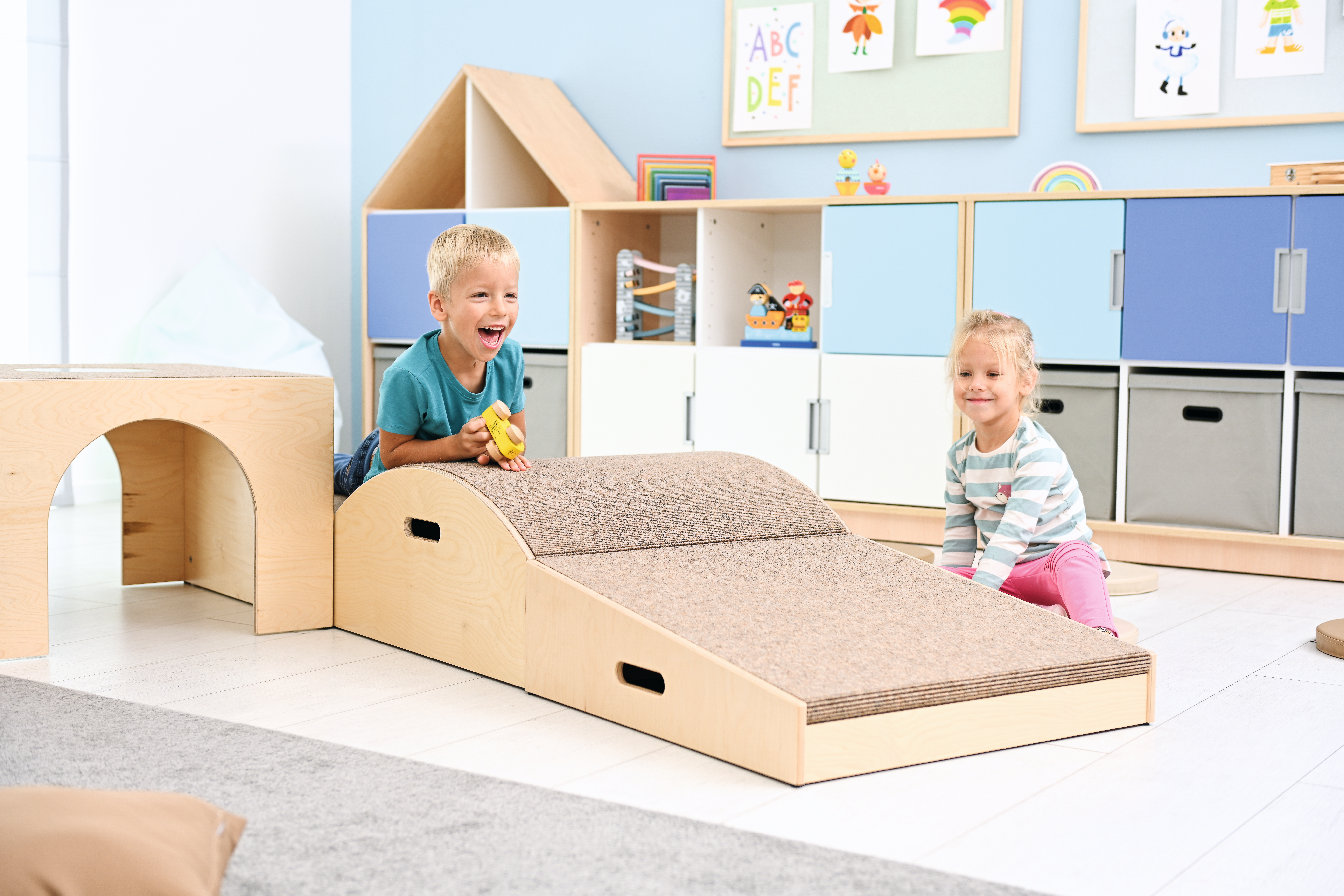 Podie rampen med monteret tæppe giver børn mulighed for aktiv leg, motorisk udforskning og balancetræning, samtidig med at den sikrer stabilitet og sikkerhed i skoler og institutioner.