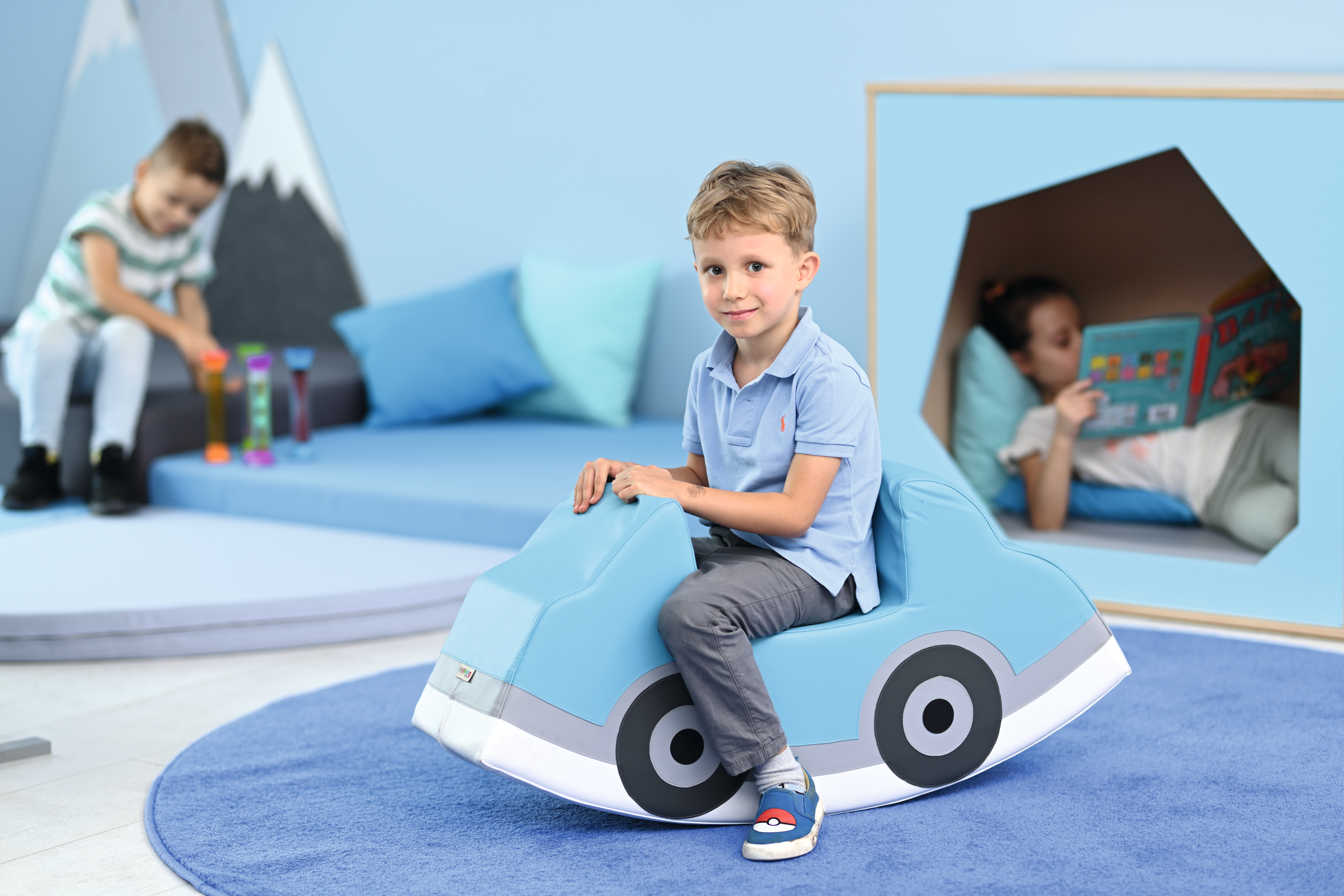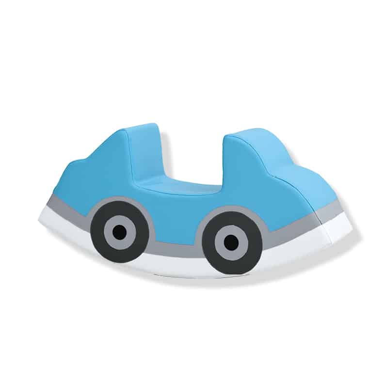 Blød skumvippe formet som bil til børn i vuggestuer og børnehaver. Perfekt til motoriktræning, balance og fantasifuld leg i daginstitutioner.