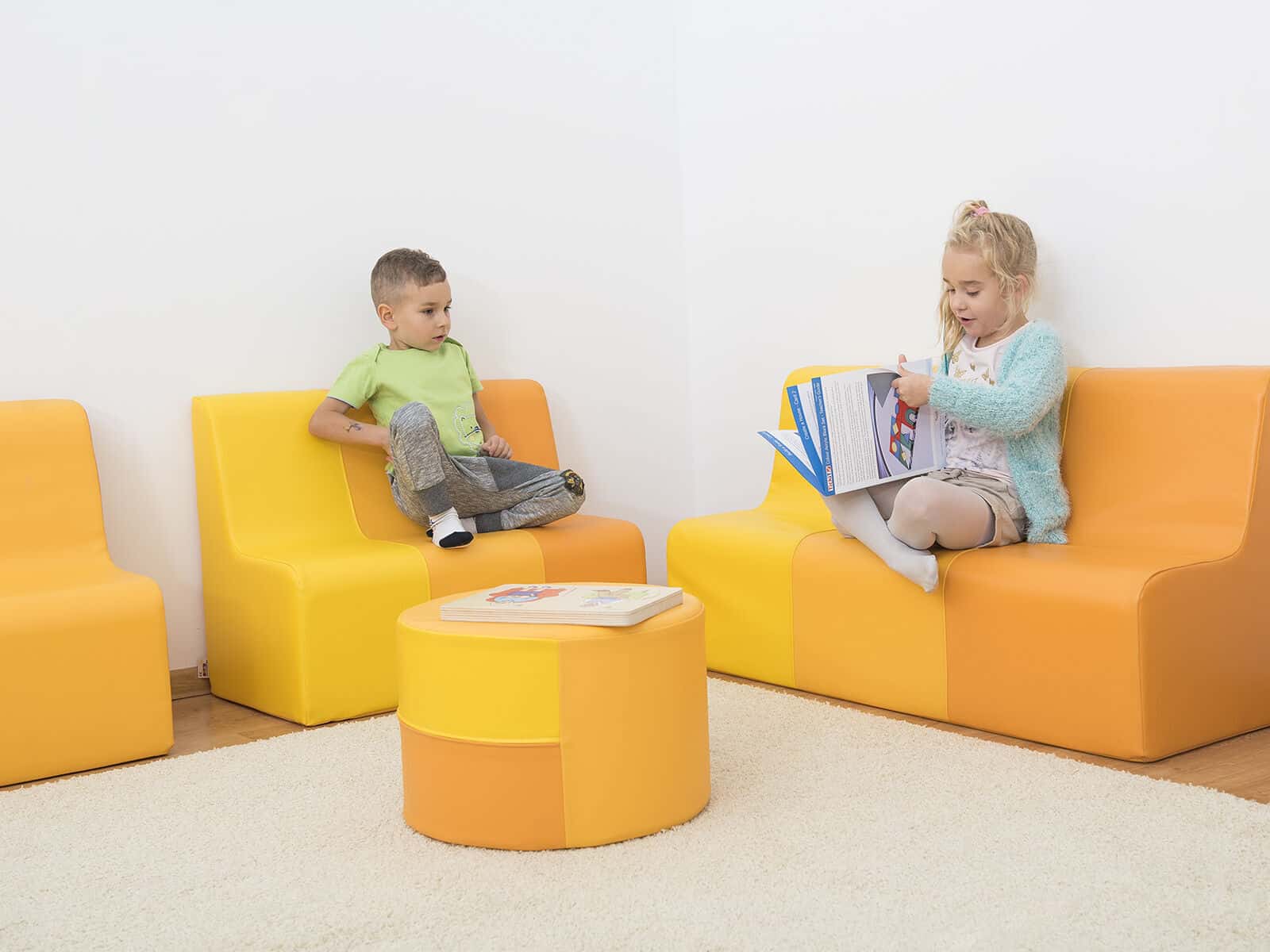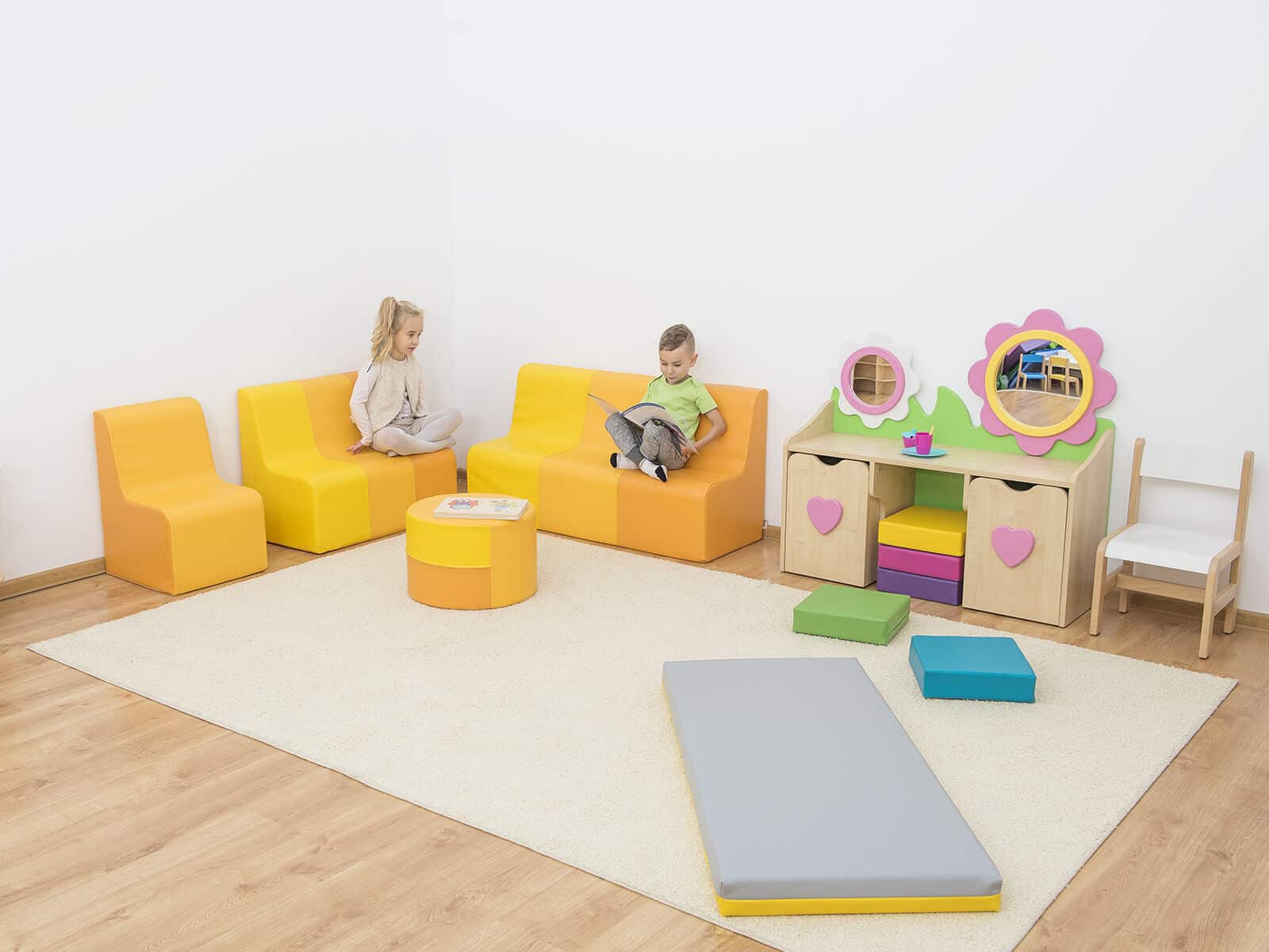Skummøbler med blødt skum med høj tæthed gør legen sjovere. Nem at rengøre. Aftageligt betræk. Skjult lynlås garanterer sikker leg, uden risiko for at blive ramt af metaldelen. Forstærkede syninger gør den ekstra slidstærk og eliminerer krølningseffekten af materialet ved gentagende tryk.