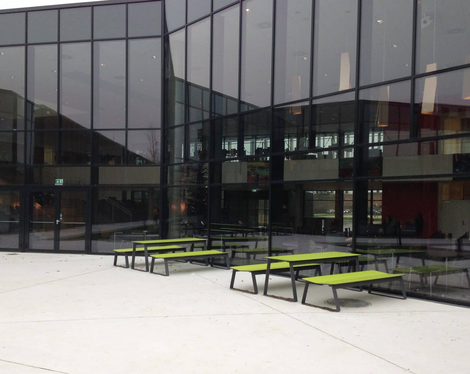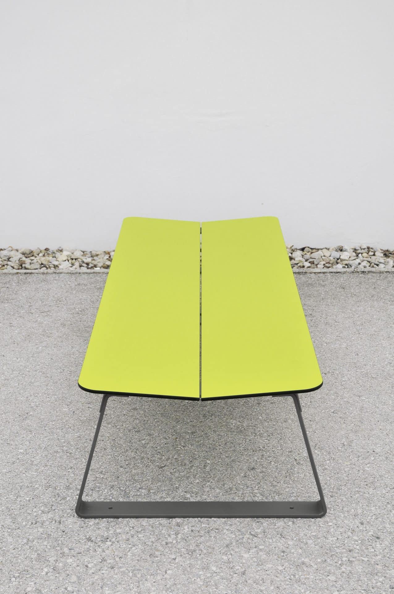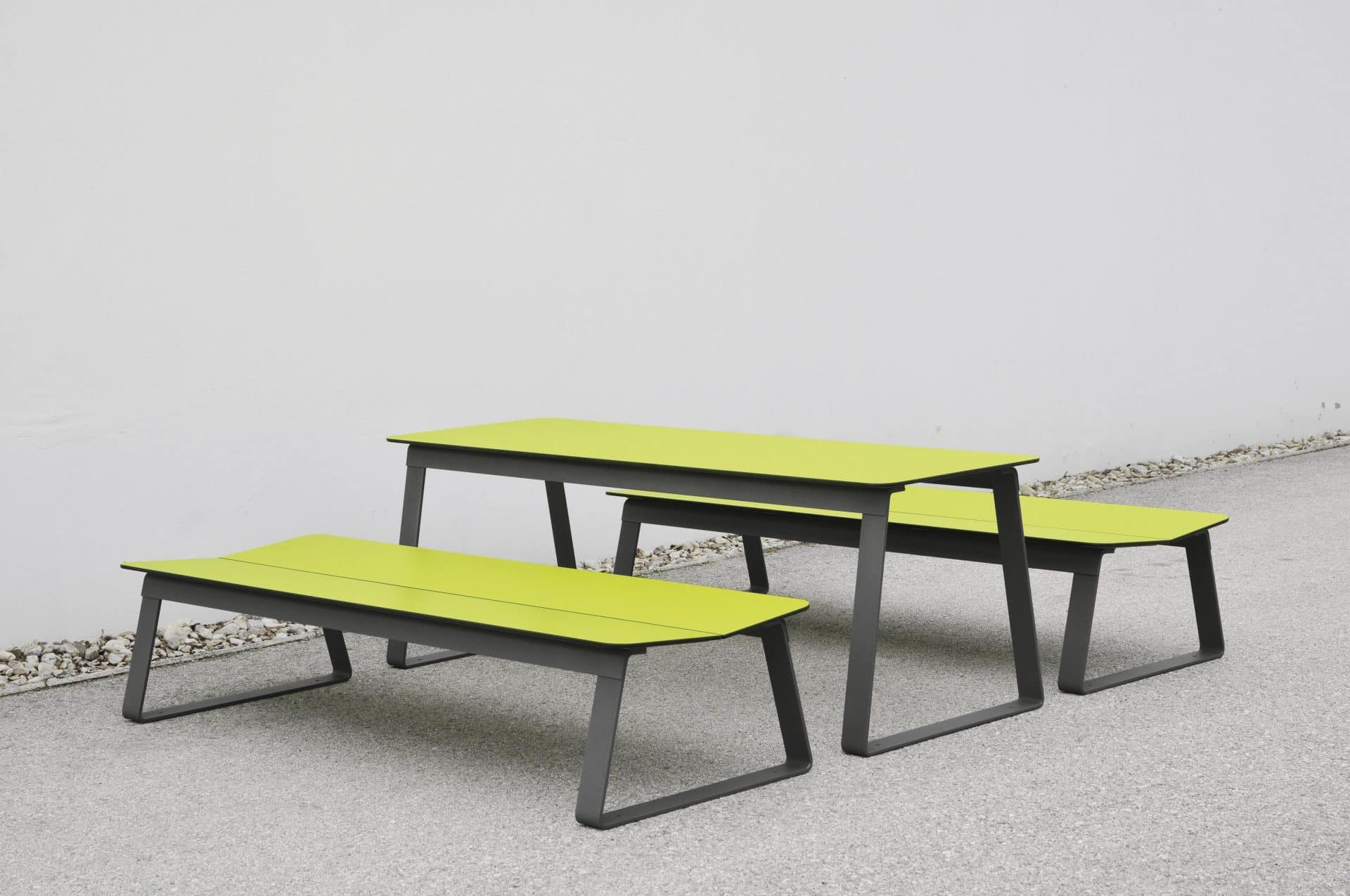 Samme dogme hviler over materialevalgene, hvor det særdeles vejrresistente og UV-stabile højtrykslaminat møder et stel af varmgalvaniseret stål med pulverlakeret overflade. Moderne teknologi og materialer muliggør et så robust element, præsenteret så enkelt, så legende let.