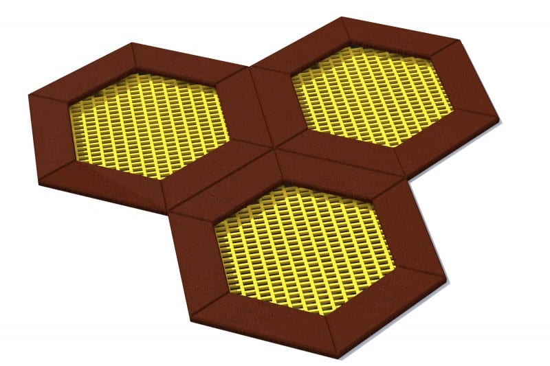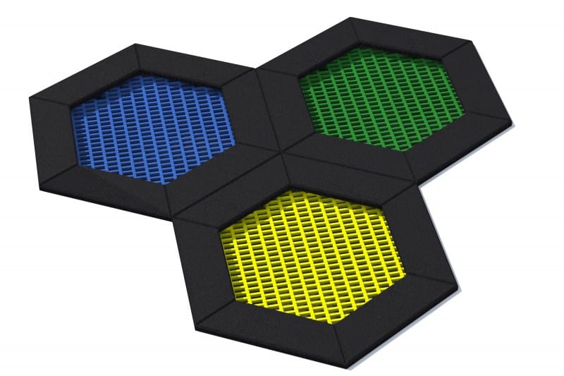 Sekskantet (honeycomb) formet trampolin til legepladser, der er i intensivt brug. Sættet indeholder 4 firkantede trampolin; 1 rektangelformet trampolin og 1 firkantet trampolin. Hoppemåtten fås i 8 farver og mange mønstre at vælge imellem. Trampolin fås i to versioner: kan åbnes og kan ikke åbnes. Den udgave der kan åbnes gør rengøring af trampolinen lettere.