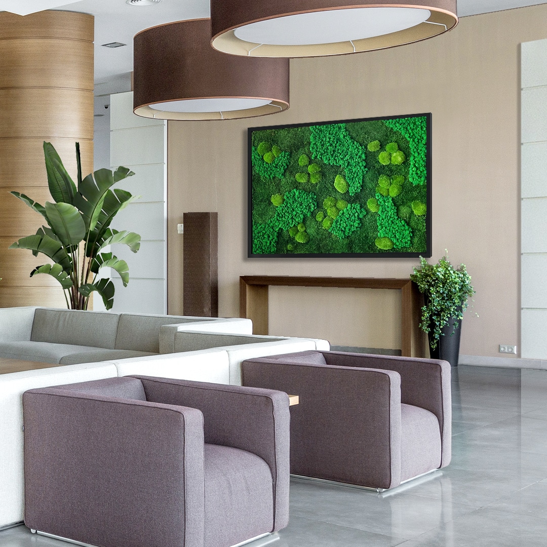 Smukt mosbillede lavet i et mix af fladmos, rensdyrmos og pudemos. Mixet skaber en flot effekt af skoven set fra oven og giver derfor et unikt islæt af natur i ethvert rum. Mosbillede kræver ingen vanding eller lys og er derfor stort set vedligeholdelsesfrit. Det må dog ikke placeres i direkte sollys. Mosset er præserveret således at det holder sig pænt i 8-10 år og samtidig hverken tiltrækker støv eller insekter. Fås med rammer i eg, sort og hvid.