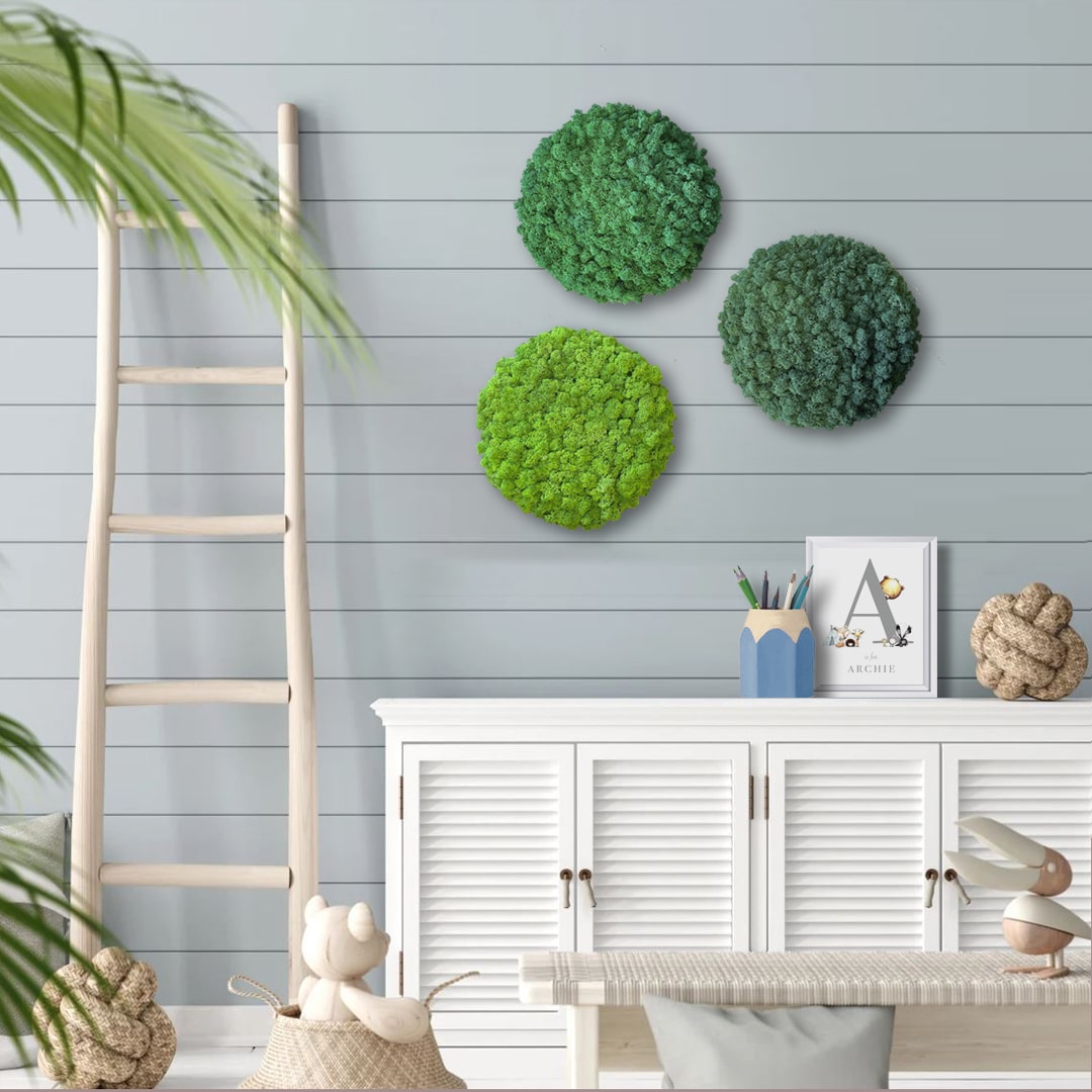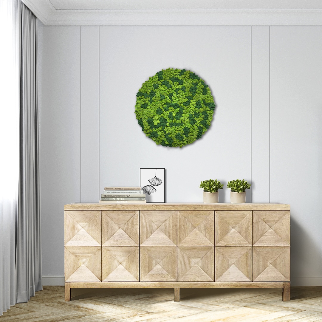 Smukt mosbillede lavet i rensdyrmos. Rensdyrmosset skaber en smuk effekt med sit bløde heterogene udseende. Mosbilledet kræver ingen vanding eller lys og er derfor stort set vedligeholdelsesfrit. Det må dog ikke placeres i direkte sollys. Rensdyrmosset findes i 12 nuancer. Mosset er præserveret således at det holder sig pænt i 8-10 år og samtidig hverken tiltrækker støv eller insekter. Fås med rammer i eg, sort, mørkebrun og hvid. Kan også leveres uden ramme.